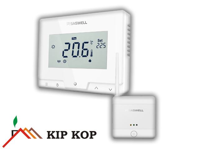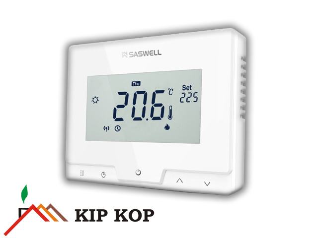 Saswell T19XWHB-7-RF bežični je termostat modernog izgleda koji u vaš dom donosi eleganciju novog dizajna. Jednostavno upravljanje putem tipki na dodir. Termostat je klasični programibilni digitalni sobni termostat koji dolazi u paketu s prijemnikom za upravljanje Vašim uređajem za grijanje. Veliki zaslon, modernog izgleda s tipkama na dodir i ugrađenim postoljem ili mogućnošću zidne montaže.