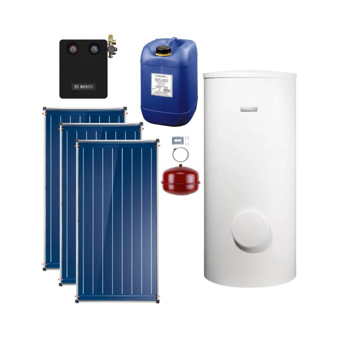 Namjena: kompletan solarni paket za pripremu potrošne tople vode za montažu na kosi krov Prednosti: - zahvaljujući kompaktnim dimenzijama potreban je manji prostor za montažu - izuzetno povoljan omjer cijene i toplinskog učinka. Sastoji se od: - FCC 220-2 V, Bosch solarni pločasti kolektor 2,09 m2, 3 kom. - FKA3, krovni priključak 3 kom. - WMT1 montažni set osnovni - WMT2 montažni set za proširenje 2 kom. - WFS 20, priključni set za montažu na kosi krov - ELT5, odzračni pribor - AGS10-2 Solarna stanica - B sol 100-2, solarna regulacija za pripremu tople vode - SAG 25, solarna ekspanzijska posuda 25 lit. - AAS 1, priključni pribor za ekspanzijsku posudu - WTF 20 solarna tekućina, 20 lit. - AS 500 DUO indirektno grijani spremnik, 500 lit.