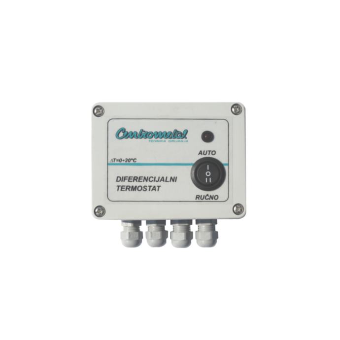Diferencijalni termostat namijenjen je ugradnji u solarne sustave i sustave centralnog grijanja gdje je potrebno uključivati tj. isključivati pumpu prema zadanoj (namještenoj) razlici temperatura. Diferencijalni termostat kompaktnih je dimenzija, smješten u plastično kućište, namijenjen ugradnji na zid. Na zid se pričvršćuje pomoću 4 vijka koji nisu isporučeni uz diferencijalni termostat. Uz diferencijalni termostat isporučuju se 2 osjetnika tipa KTY koji se jednostavno spajaju na diferencijalni termostat, a sami osjetnici se pričvršćuju na cijev pomoću plastičnog pokrova i vezice. Namještanje diference paljenja/gašenja pumpe vrši se pomoću trimera koji je smješten unutar kućišta termostata i tvornički podešen na diferencu od 10°C. Kompaktno kućište za jednostavnu montažu na zid. Odabir rada diferencijalnog termostata: automatski rad ili ručno. Prikaz rada diferencijalnog termostata preko signalne lampice. Mogućnost namještanja područja paljenja/gašenja termostata: 0-20°C. Isporučuje se sa svim potrebnim osjetnicima.