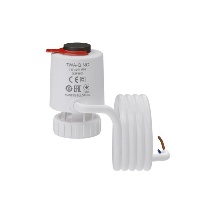 TWA-Q, 230 V, 5 mm, NC, termički pogon, kabel 1.2 m Bruto težina- 0.18 kg Neto težina- 0.1 kg Duljina kabela [m]- 1.2 m Hod [mm]- 5 mm Kompatibilnost s dimenzijom ventila AB-QM- DN 10-32 Napon napajanja [V] AC- 230 V Položaj isključenog napajanja- Normalno zatvoren Razred zaštite IP-a- IP 54 Skupina proizvoda- Termički pogoni Vrsta- TWA-Q Vrsta regulacijskog signala- Uključeno/isključeno i PWM