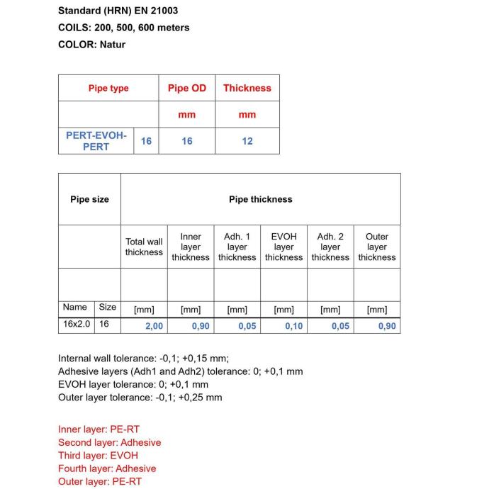 Cijev je izrađena od fleksibilnog i izdržljivog materijala otpornog na visoke temperature - PERT. Dodatno je zaštićena EVOH barijerom koja sprječava prodor kisika u unutrašnjost instalacije i pridonosi zaštiti drugih komponenti sustava, poput radijatora i ventila, te služi kao zaštita od korozije.