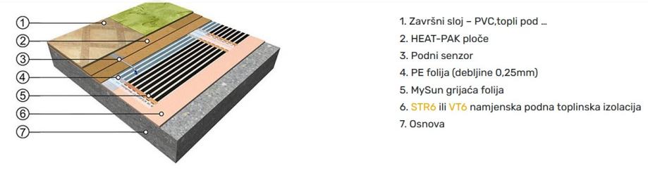Izolacijske ploče STR6 namijenjene su dodatnoj toplinskoj izolaciji poda i postavljaju se izravno ispod grijaće folije MySun. Osim izolacijske funkcije, značajno olakšavaju postavljanje same grijaće folije jer je kod potonje potrebno u podu na određenim mjestima napraviti utore u koje se uvlače priključni kabeli, podni senzor i kontakti između priključnih kabela i grijaće folije. Izrada utora u izolacijskim pločama STR6 vrlo je jednostavna i iznimno brža i lakša od izrade utora u estrihu, OSB pločama i sl.