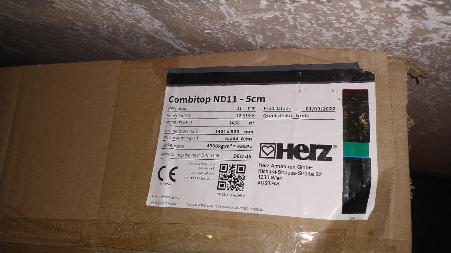 -Raster za polaganje cijevi za podno grijanje HERZ Combitop ND 11, dimenzije jedne ploče su 1.4m x 0.8m (1.12 m2) i debljina iznosi 3 cm. Na etiketi piše ND 11 - 5 cm, ali je raster debeo 3 cm kao što se vidi na slici. Ukupno ima 15 ploča, ili 16.8 m2. Cijena jedne ploče je 5.5 EUR. Ploče su nove, nisu ugrađivane i neoštećene su.