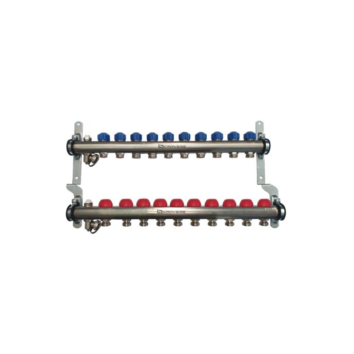 Razdjelnik s termostatkim ventilima u povratu i regulacijskim ventilima u polazu za priključak krugova podnog grijanja Razdjelnik je uređaj kojima se određuje udio toplinske energije, služi za razdiobu potrošnje po radijatorima. Broj krugova: 10