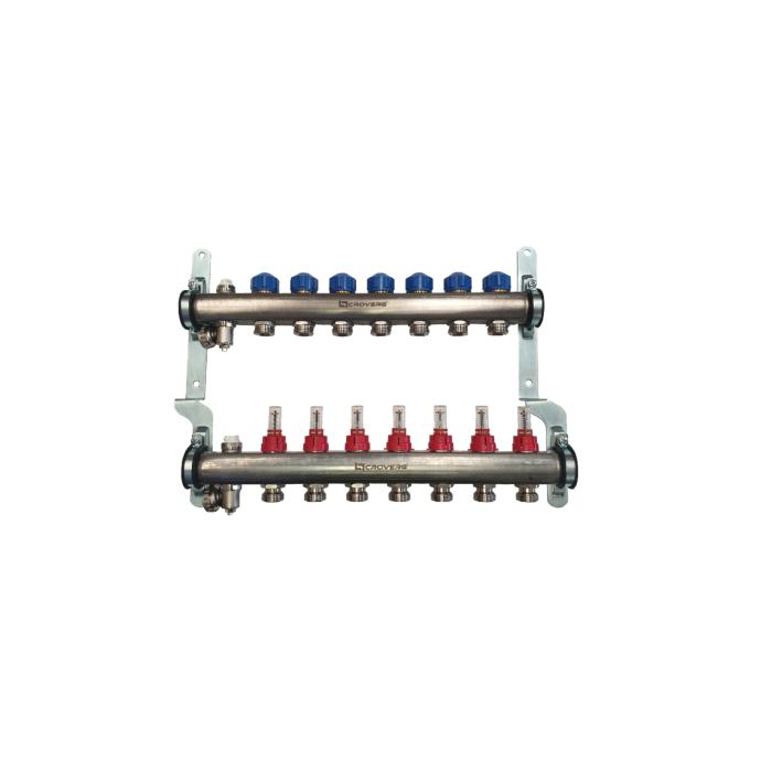 Razdjelnik s termostatskim ventilima i pokazivačima protoka u polaznom vodu za priključak krugova podnog grijanja. Polazni i povratni razdjelnik izradeni su iz visokokvalitetnog plemenitog celika 1.4301. Svaki prikljucak pojedinog kruga podnog grijanja na polaznom razdjelniku opremljen je topmetrom, kojim je omogucena regulacija svakog kruga podnog grijanja podešavanjem protoka vode sustava podnog grijanja. Protok tople vode u pojedinom krugu podnog grijanja definiran je projektom. Svaki prikljucak pojedinog kruga podnog grijanja na povratnom razdjelniku opremljen je termostatskim ventilom sa rucnom regulacijskom kapom. Regulacijska kapa može se zamijeniti termostatskom glavom ili termoelektricnim pogonom. Termostatskim ventilima održava se konstantna temperatura u prostoru tretiranom podnim grijanjem. S elektropogonom predregulacija je osigurana u skladu sa signalom sa sobnog termostata. Za odzracivanje sustava podnog grijanja na polaznom i povratnom razdjelniku ugradeni su rucni odzracni ventili. Holenderi 1"-samozaptivajući, niklovani Čepovi 1"-samozaptivajući, niklovani Kuglasta slavina 3/4" Broj krugova: 7