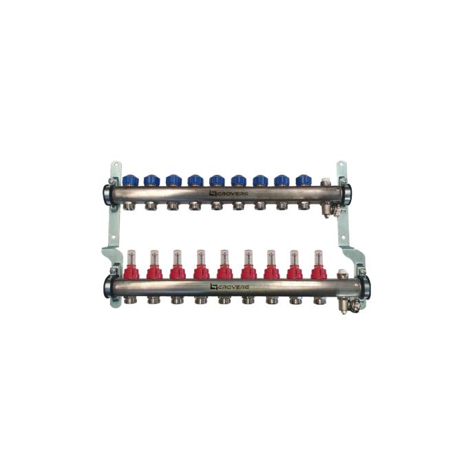 Razdjelnik s termostatskim ventilima i pokazivačima protoka u polaznom vodu za priključak krugova podnog grijanja. Polazni i povratni razdjelnik izradeni su iz visokokvalitetnog plemenitog celika 1.4301. Svaki prikljucak pojedinog kruga podnog grijanja na polaznom razdjelniku opremljen je topmetrom, kojim je omogucena regulacija svakog kruga podnog grijanja podešavanjem protoka vode sustava podnog grijanja. Protok tople vode u pojedinom krugu podnog grijanja definiran je projektom. Svaki prikljucak pojedinog kruga podnog grijanja na povratnom razdjelniku opremljen je termostatskim ventilom sa rucnom regulacijskom kapom. Regulacijska kapa može se zamijeniti termostatskom glavom ili termoelektricnim pogonom. Termostatskim ventilima održava se konstantna temperatura u prostoru tretiranom podnim grijanjem. S elektropogonom predregulacija je osigurana u skladu sa signalom sa sobnog termostata. Za odzracivanje sustava podnog grijanja na polaznom i povratnom razdjelniku ugradeni su rucni odzracni ventili. Holenderi 1"-samozaptivajući, niklovani Čepovi 1"-samozaptivajući, niklovani Kuglasta slavina 3/4" Broj krugova: 9