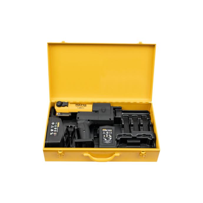 Akumulatorska radijalna preša s prisilnim radom i nadzorom pritiska preše, za izradu prešanih spojeva, ovisno o sustavu o promjeru. 10 - 108 (110) mm, promjer. 3/8 - 4"". Za pogon REMS kliješta/prstenova za stiskanje i odgovarajućih kliješta/prstenova za stiskanje drugih proizvođača. Okretni držač stiskalnih kliješta s automatskim zaključavanjem. Elektrohidraulički pogon s baterijskim motorom visokog momenta 21,6 V, 380 W, robusnim planetarnim prijenosnikom, ekscentričnom klipnom pumpom i kompaktnim hidrauličkim sustavom visokih performansi. Antivibracijski sustav. Sigurnosni prekidač vrha. LED radno svjetlo. Li-Ion baterija 21,6 V, 2,5 Ah, Li-Ion brzi punjač 230 V, 50 - 60 Hz, 90 W. U čvrstoj kutiji od čeličnog lima.