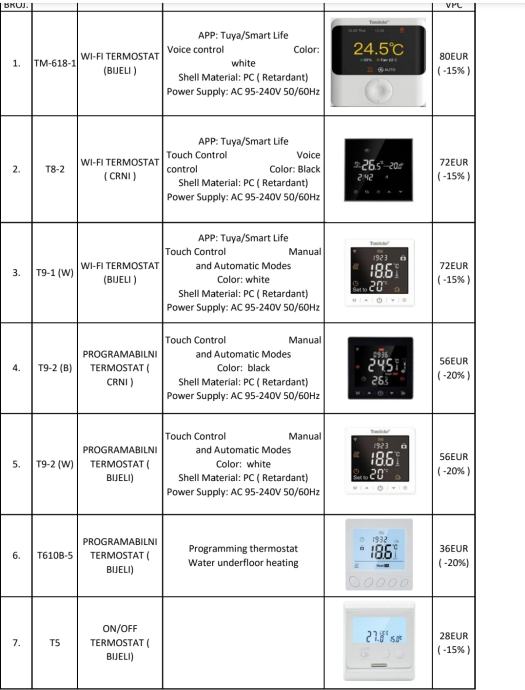 Prodajem vise modela termostata za podno grijanje. Cijene navedene na slici su VPC sa dodatnim rabatom navedenim kod svakog modela. U 1. Mjesecu dodatni popust od 20%. Za vecu kolicinu veci rabat. Za kompletnu kolicinu 60% popusta. Za raspolozivost molim kontakt na broj 0921680807.
