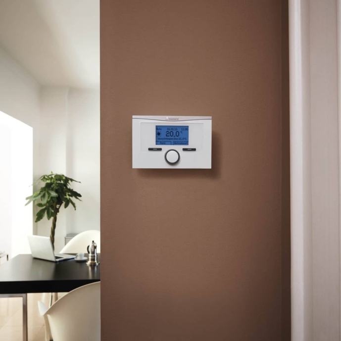 Nova generacija digitalnog sobnog termostata koja omogućava upravljanje Vaillantovim uređajem ovisno o sobnoj temperaturi. Termostat posjeduje tjedni program (tri razdoblja po danu) za vremensko upravljanje temperaturom prostora te pripremom potrošne tople vode s funkcijom jednokratnog punjenja spremnika. LC zaslon sa plavim pozadinskim osvijetljenjem te potpuno novo načelo rukovanja pruža korisniku jednostavan unos parametara te očitavanje aktualnih vrijednosti. Korisniku su također na raspolaganju posebne funkcije koje dodatno povećavaju komfor sustava grijanja (funkcija godišnjeg odmora, party funkcija, funkcija „nema me kod kuće“, funkcija „ cijeli dan kod kuće“, automatsko prebacivanje podešenog vremena ljeto/zima). Sobni termostat moguće je primjeniti u kombinaciji s novom generacijom Vaillant uređaja s eBUS vezom. calorMATIC 350f bežična je varijanta ovog sobnog termostata kod kojega se veza između samog regulatora te jedinice bežičnog primjenika vrši preko bežične veze (868 MHz).