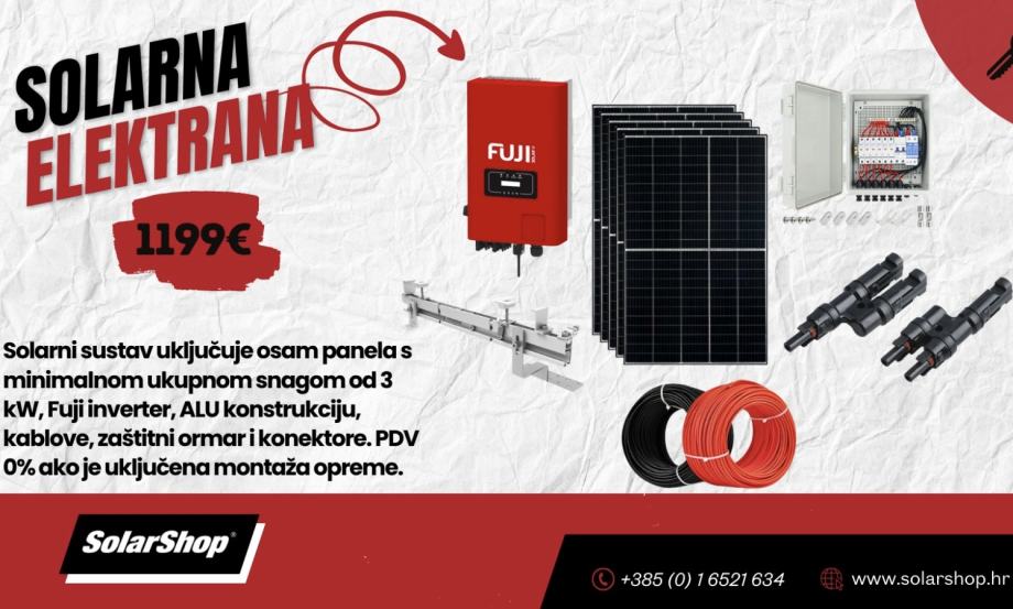 3kW monofazna 1199€ (solarni paneli 8x390W ili 7x425W , inverter 3kW Huawei ili Fuji , konstrukcija , kablovi , zaštitni ormar , konektori ..)