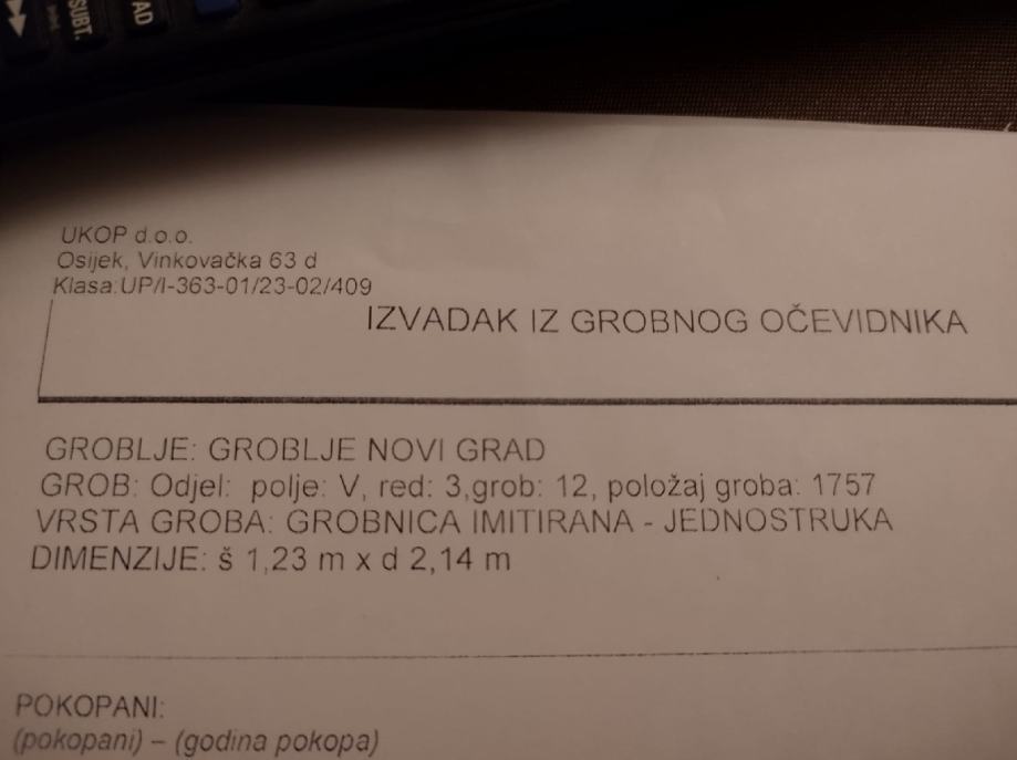Grobnica imitirana jednostruka, dimenzije:
