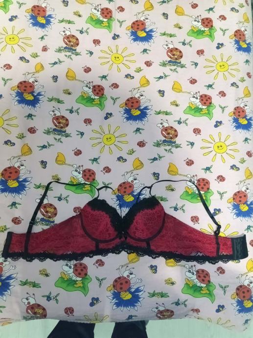 Crno-crveni pushup grudnjak.B košarica, s ukrasom iznad grudi.