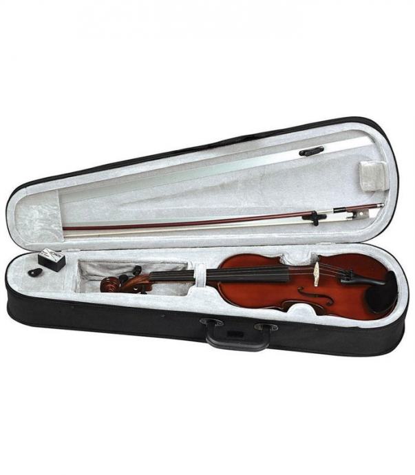 Violina Gewa 4/4. Vrh smreka, pozadina javor. Tamni crveno-smeđi lak. Brazilsko gudalo, podbradak, kalofonij. Lagani kofer.