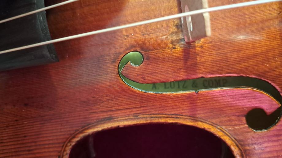Violina 4/4, je nastala u radionici A.Lutz & comp.,između 1850-1880, restaurirana 1933 g. u Zagrebu u radionici Julio Penc. Violina je nedavno obnovljena sa novim ključevima, novi žičnjak, nove žice marke Larsen Tzigane. Potrebno je novo gudalo. Violina je potpuno ispravna i usvirana. Ukoliko ste zainteresirani, možemo Vam poslati videosnimak za provjeru zvuka violine.