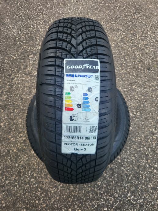 Nove cjelogodišnje gume Goodyear Vector 4seasons G3, dimenzije 175/65/14. Gume su nove s naljepnicama, potpuno novi model gume, nikad montirane na vozilo. Mogućnost montaže. Cijena po komadu 71 eura..
