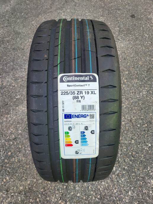 Set od četiri nove ljetne gume Continental SportContact 7, dimenzije 225/35/19. Gume su nove s naljepnicama, nikad montirane na vozilo, DOT2522. Gume su pravilno skladištene, na suhom i tamnom, mekane i bez tragova stajanja. Mogućnost montaže. Cijena po komadu 110 eura, fiksna, (regularna cijena guma je 178 eura).