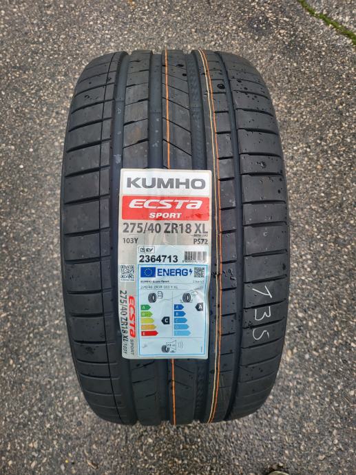 Nove ljetne gume Kumho Ecsta Sport PS72, dimenzije 275/40/18. Gume su nove s naljepnicama, nikad montirane na vozilo, svježi DOT, novi model Kumho gume. Mogućnost montaže. Cijena po komadu 135 eura.