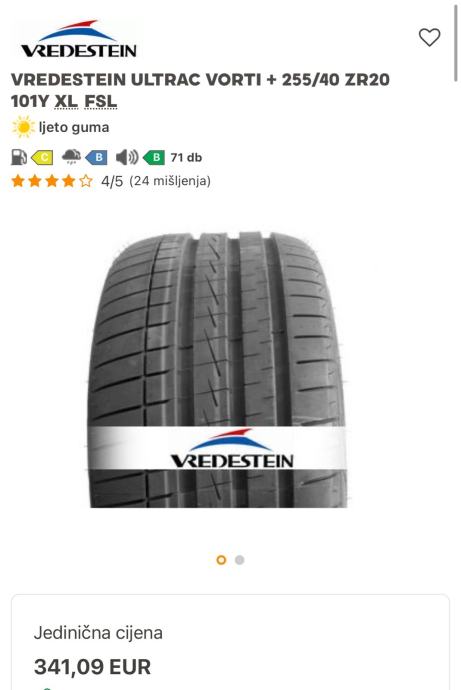 Prodajem ljetnu gumu VREDESTEIN UltraVorti+, dimenzije 255/40 ZR20, odlično stanje,nije krpana niti pokidana, DOT 1324! Cijena 25EUR! (nova guma je 340EUR)! Imam samo 1 komad! Osobno preuzimanje Sesvete!