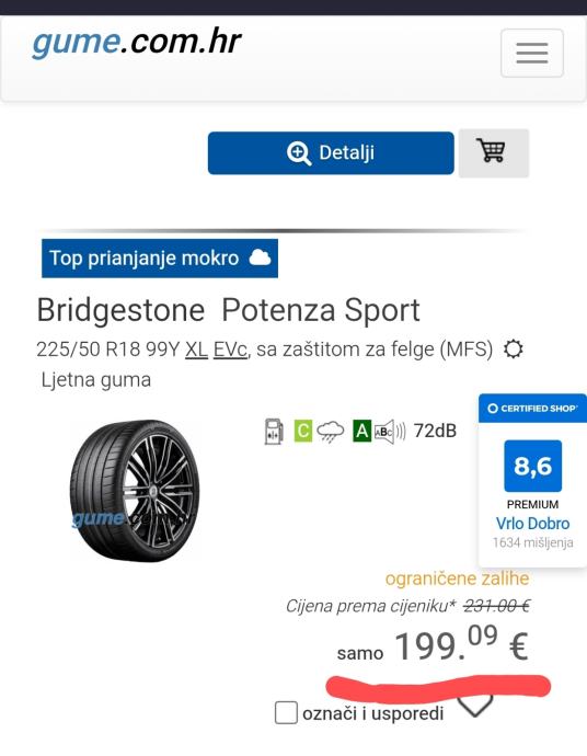 Dvije izvrsne kvalitetetne ljetne Gume BRIDGESTONE POTENZA SPORT 225/50 R18 mladog Dot-a sa duboko-jakom ripnom