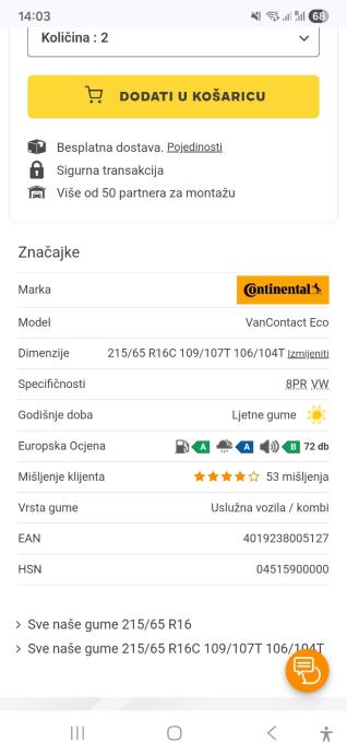 Za prodaju je potpuno novi set ljetnih guma Continental VanContact Eco koji je ostao nakon prodaje kombija. Dimenzije 215/65 R16C. Gume su ojačane i namijenjene za teretna vozila. Datum proizvodnje: 19. tjedan 2023. godine. Gume su prešle manje od 1000 km. Imaju klasifikaciju A za potrošnju goriva i klasifikaciju A za prianjanje na mokroj podlozi. Nova takva guma danas košta oko 150 €. Uz gume prodajem i 4 originalni felge za Renault Trafic III s ugrađenim TPMS senzorima.