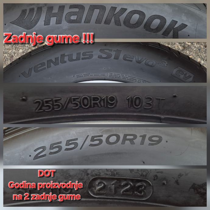 Polovne ljetne gume 235/55R19 101T - 255/50R19 103T / prednje gume DOT3123 - 31 sedmica 2023 godine / zadnje gume DOT2123 - 21 sedmica 2023 godine / sve 4 gume Hankook Ventus S1 EVO3 / Dubina sare na sve 4 gume 6 mm