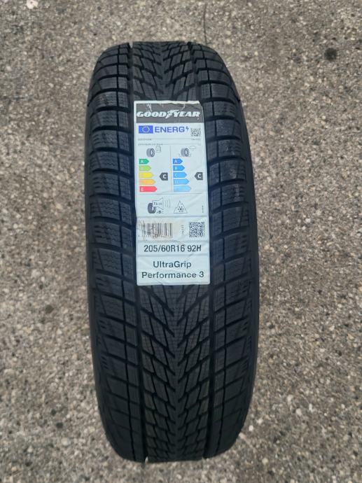 Nove zimske gume Goodyear Ultragrip Performance 3, dimenzije 205/60/16. Gume su nove s naljepnicama, potpuno novi model gume, nikad montirane na vozilo. Mogućnost montaže. Cijena po komadu 105 eura..