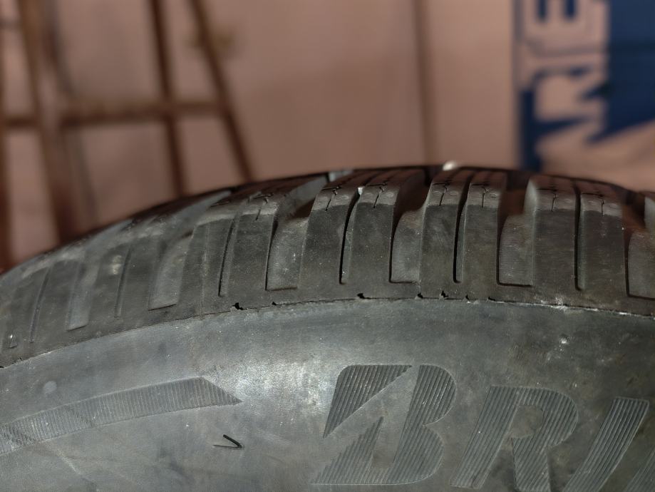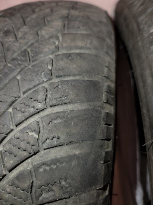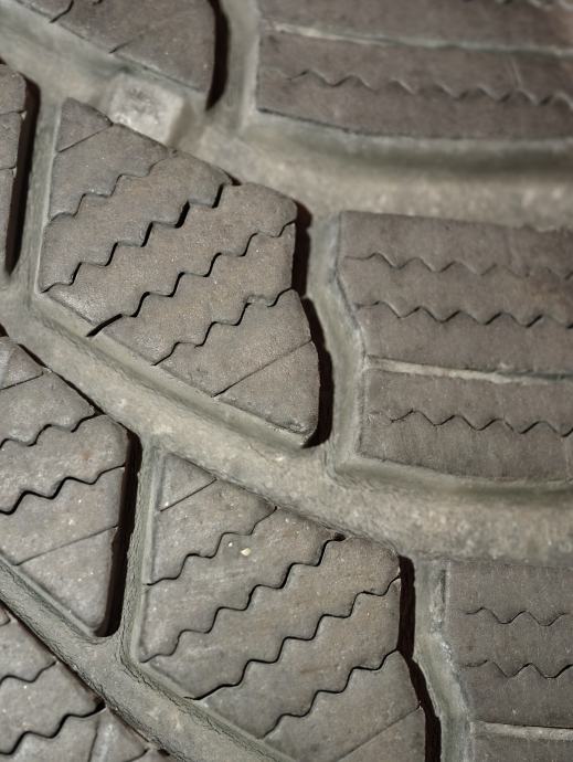 Dvije gume su dobre, dvije su lošije. Gume su vožene dvije zimske sezone, ali prošle sezone nismo primjetili da bi trebalo napraviti optiku (špur) pa su se gume na prvim kotačima dosta istrošile, najviše s unutarnje strane, gotovo na 0 (zadnje dvije fotografije), a ostatak gume ima još 3.5 - 4.0 mm dubine gaznog sloja (ripne, profila). Gume koje su bile na zadnjim kotačima imaju još 5.5 - 6.0 mm ripne.