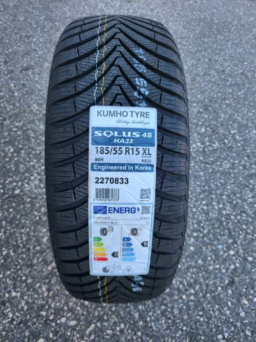 Nove cjelogodišnje gume Kumho Solus 4S HA32, dimenzije 185/55/15. Gume su nove s naljepnicama, potpuno novi model gume, nikad montirane na vozilo. Mogućnost montaže. Cijena po komadu 73 eura..