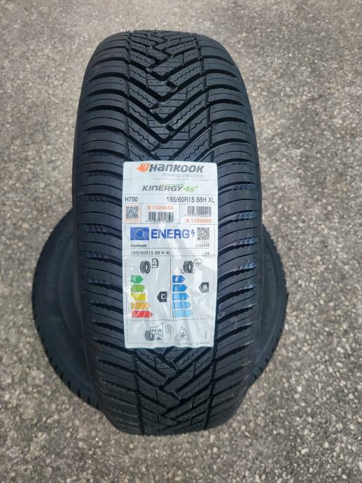 Nove cjelogodišnje gume Hankook Kinergy 4 Season H750, dimenzije 185/60/15. Gume su novi model Hankook gume, s naljepnicama, nikad montirane na vozilo, svježi DOT. Mogućnost montaže. Cijena po komadu 76 eura.