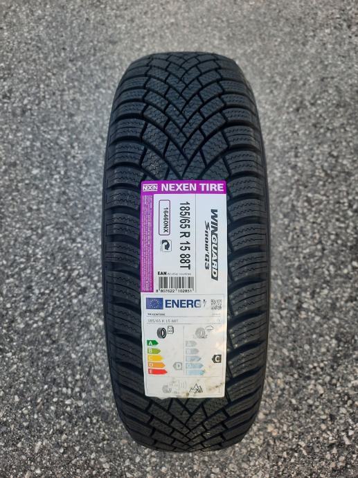 Nove zimske gume Nexen Winguard Snow G3, dimenzije 185/65/15. Gume su potpuno nove s naljepnicama, nikad montirane na vozilo, svježi DOT, potpuno novi model gume. Mogućnost montaže. Cijena po komadu 53 eura.