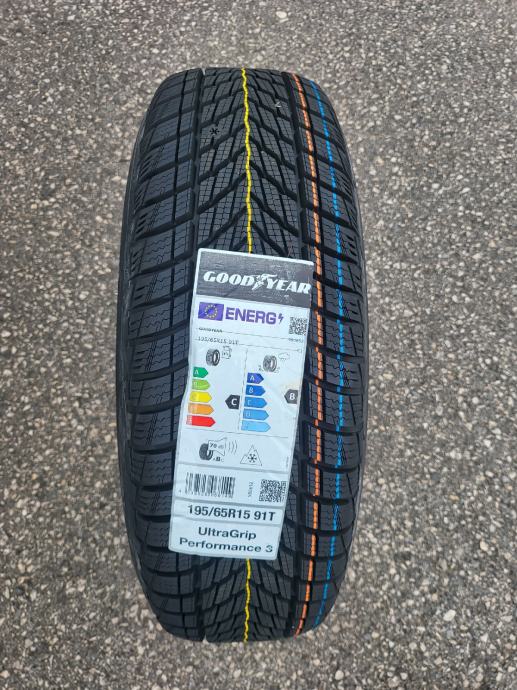 Nove zimske gume Goodyear Ultragrip Performance 3, dimenzije 195/65/15. Gume su nove s naljepnicama, nikad montirane na vozilo, svježi DOT, potpuno novi model gume. Mogućnost montaže. Cijena po komadu 71 eura.