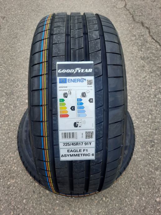 Nove ljetne gume Goodyear Assymetric 6, dimenzije 225/45/17. Gume su nove s naljepnicama, nikad montirane na vozilo, svježi DOT, potpuno novi model gume. Mogućnost montaže. Cijena po komadu 91 euro.