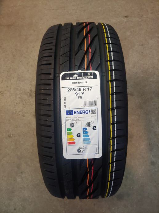 Nove ljetne gume Uniroyal Rainsport 5, dimenzije 225/45/17. Gume su potpuno nove, novi model, odlične na mokrom (ocjena A), svježi DOT.. Mogućnost montaže. Cijena po komadu 76 eura.