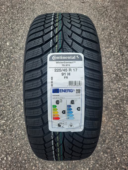 Nove zimske gume Continental WinterContact TS870, dimenzije 225/45/17. Gume su potpuno nove s naljepnicama, nikad montirane na vozilo, svježi DOT, novi model gume. Mogućnost montaže. Cijena po komadu 137 eura.