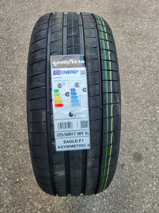 Nove ljetne gume Goodyear Assymetric 6, dimenzije 225/50/17. Gume su nove s naljepnicama, nikad montirane na vozilo, svježi DOT, potpuno novi model gume. Mogućnost ugradnje. Cijena po komadu 129 eura.