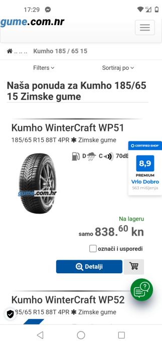 Prodajem 2 zimske gume KUMHO dimenzija 185/65 R15 DOT 1716. Gume mogu bez problema voziti još dvije sezone ili čak tri. Jako dobre na kiši. Cijena za obe je 60 €. Dubina ripne je 6.2 mm. Cijena nove je trenutno 840 kn.