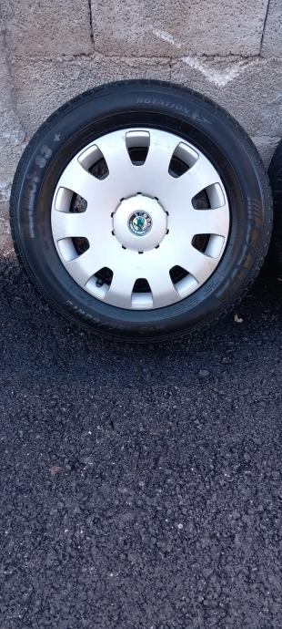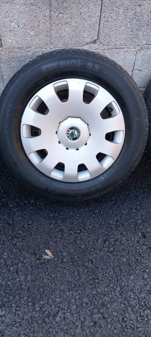 Prodaju se četiri felge sa zimskim gumama Sava eskimo i orginalnim ratkapama za Škodu Tour 5x100, 6Jx14, ET 38 te srednji promjer 57,1