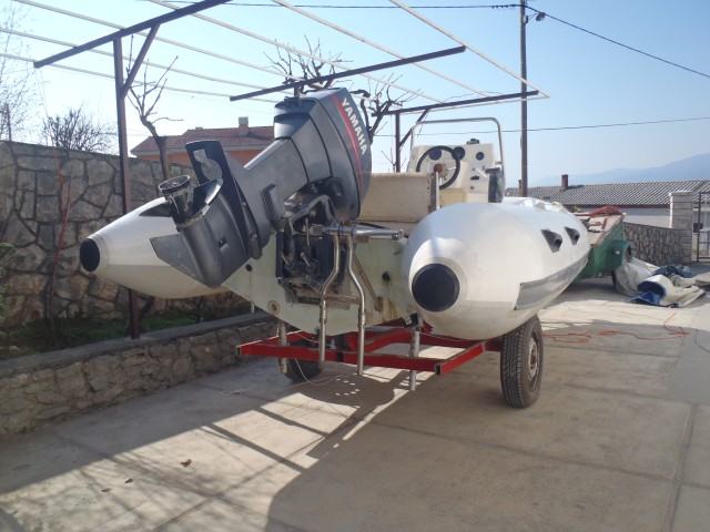Arimar u dobrom stanju, 1998 g., Yamaha 60 dvotaktna 1998 g., prodajem, sa neregistriranom prikolicom. Motor nema brojač sati. U moru je bio samo po sezoni. Zadnje tri sezone stoji pred kućom, jer nemam više vremena za barku. Tubusi su od PVC-a, imaju par sitnih zakrpi, ali nigdje nisu ozbiljno zaparani. Vizualno su u lošem stanju i realno treba ih promjenit i stavit hypalonske tubuse, da bi gumenjak bio ko nov, trošak cca 2000 eura.