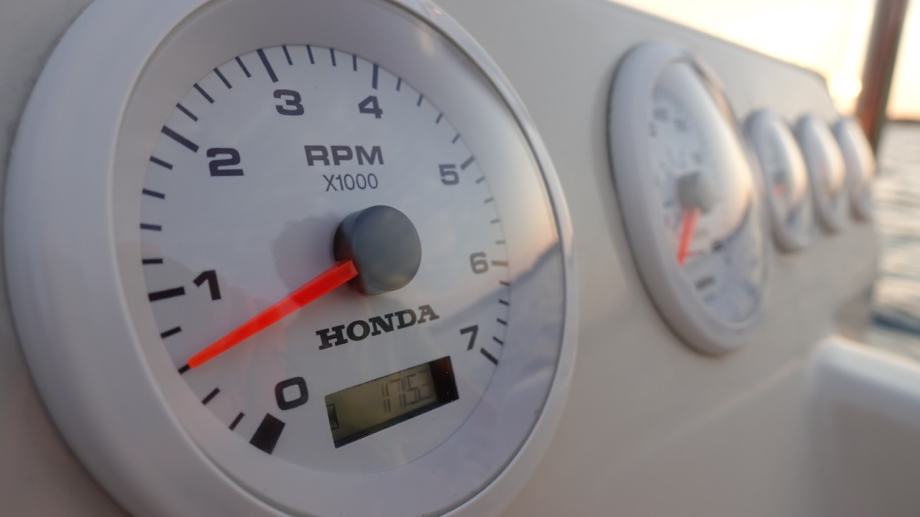 Motor HONDA 90Ks. Samo 214 sati rada. Čamac nikad nije bio rentan, mjesec dana u moru svake sezone. Preko zime suhi vez.