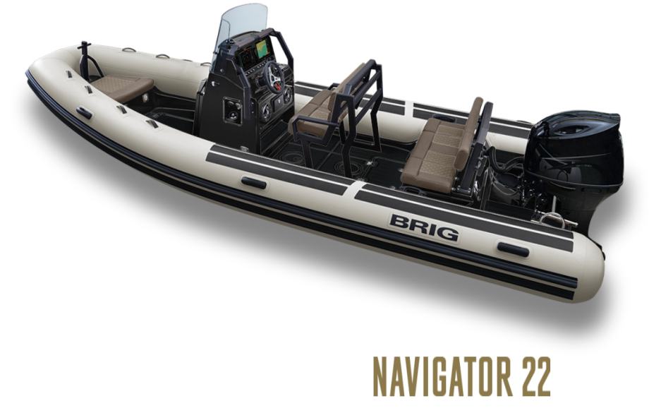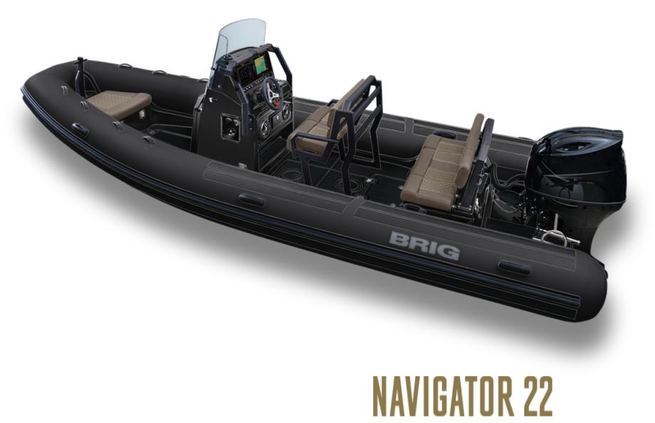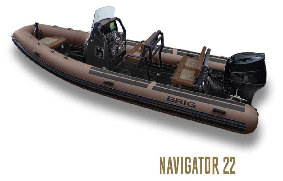 Novodizajnirani BRIG Navigator 22 je posebno konstruiran i kvalitetan gumenjak s izvrsnim maritimnim osobinama (brzo izglisira, bez prskanja unutra, sposoban za velike brzine, prima snažne motore, primjerena lateralna stabilnost, posebna ergonomija i komfor, itd.).