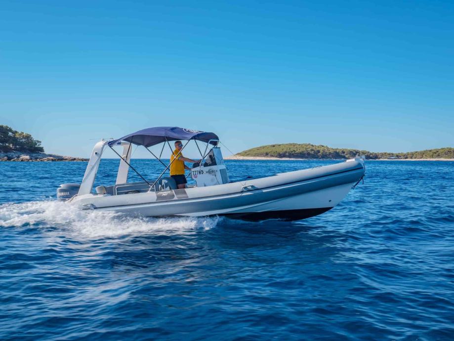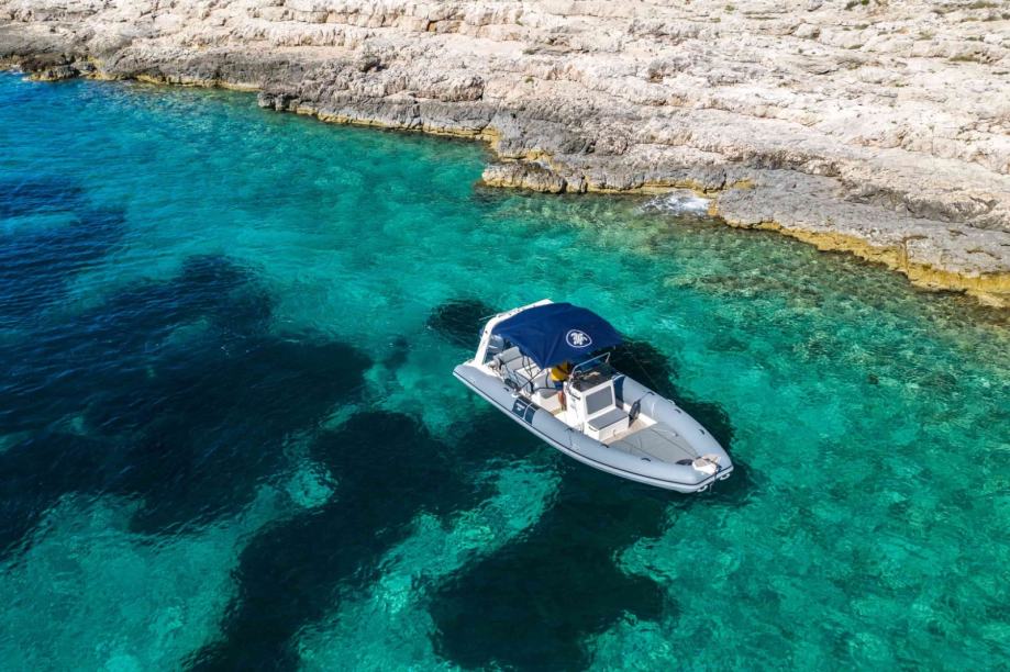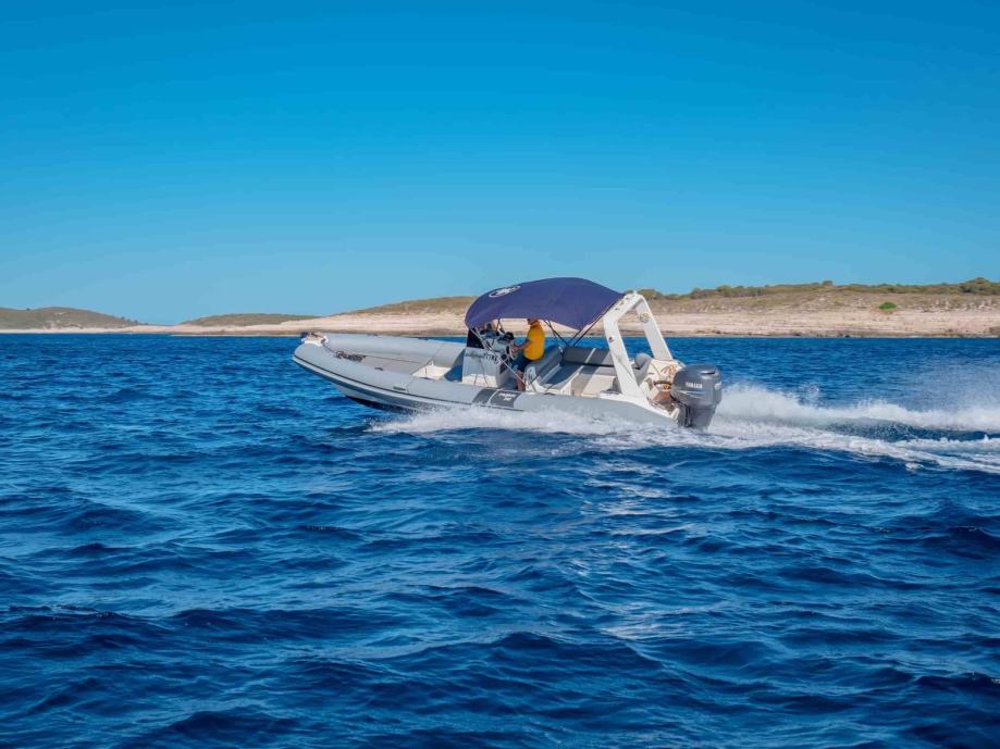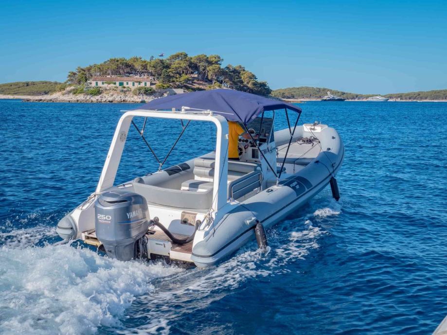 Motor Yamaha 250 ks servisiran svako 100 h, redovito opran od kamenca i nikad nije imao ni jedan kvar. Brod registriran za 12 putnika +skipper i mornar, sluzio za ture do modre spilje (sa skiperom, nikad u renti i slicno).