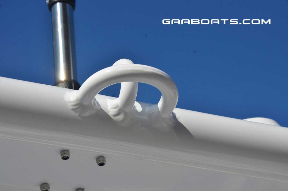 Duboki V, praškasto obložen aluminijski trup s «GALA TABS», skrivenim ojačanim nosačima krmene grede i štitnikom za kobilicu.