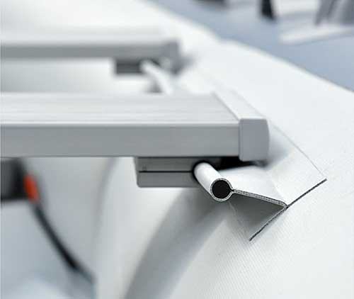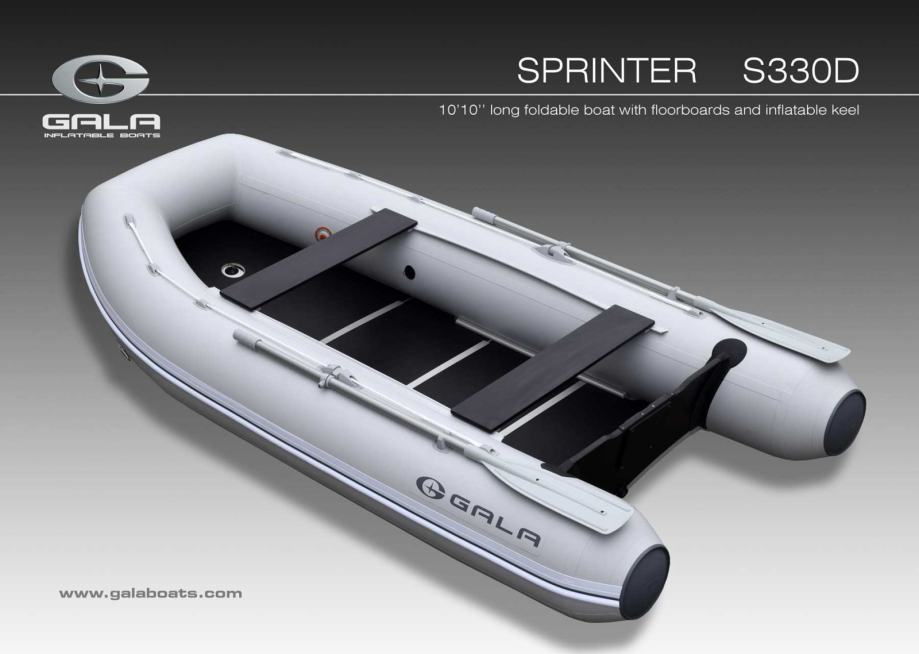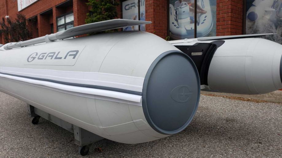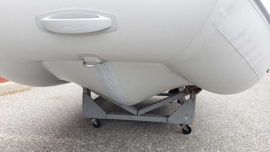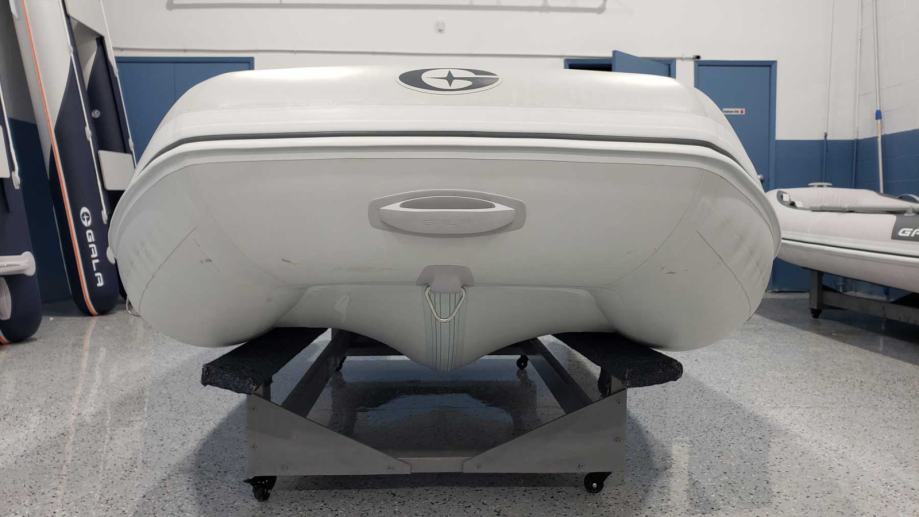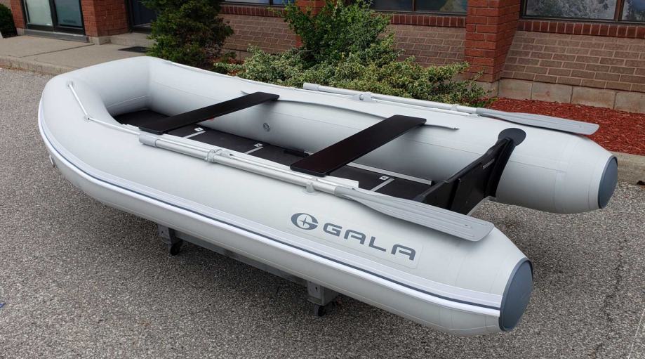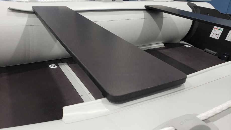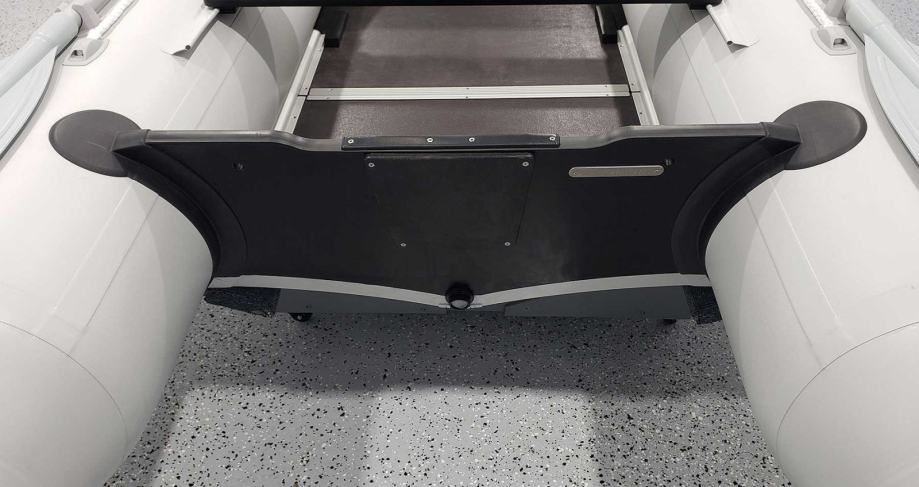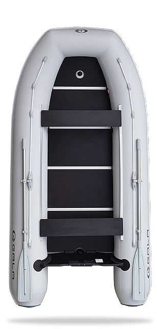 Meko zakrivljena 3-komorna VALMEX-PVC tuba, dvostruka čvrstoća: VARENI spojevi, dno u obliku slova V s kobilicom na napuhavanje, čvrsti pod s laminiranim podnim pločama i gredama za ojačanje od eloksiranog morskog aluminija, laminirana krmena zrcala, 2 sjedala s kliznim sustavom postavljanja, 2 ušice za vuču od nehrđajućeg čelika, ručke, nadtlačni ventil,čvrsta traka za trljanje sa zaštitom od prskanja, jednosmjerni odvodni ventil s ručkom za izvlačenje, dva vesla s bravama i graničnicima za vesla, visokoučinkovita nožna pumpa, dvije torbe, komplet za popravak i priručnik
