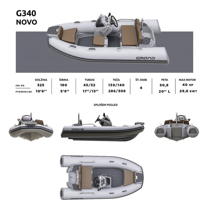 Model G340N je potpuno modificiran model sa svim poboljšanjima tijekom godina. Svaki model se ponosi jedinstvenom zaštitom od prskanja koja osigurava suhu vožnju čak i kad je more uzburkano ili kada plovimo protiv vjetra. Vlasnici tendera posebno cijene eleganciju, moderni dizajn i tehnološke prednosti koje plovilo nudi. Serija Golden Line se ističe upravo po tome. Tvornica se pobrinula za optimizaciju na 2 ključna segmenta: težinu i duljinu plovila. Konačna duljina iznosi 325 cm, a suha težina plovila iznosi samo 130-140 kg (ovisno o opremi). Ugrađeni rezervoar za gorivo premješten je prema prednjem dijelu, čime se raspoređuje težina na plovilu u omjeru s motorom straga. Montirani motor može imati snagu do 40 konja i osovinu L. Unatoč tome, u pramcu su zadržali mali prostor za odlaganje i povećali stražnji dio ispod glavne klupe. Nova verzija modela G340N također nudi stabilniju bočnu klupu pored glavne konzole i dodatni pretinac za pohranu. Taj se pretinac nalazi ispod sjedala i stoga ne zauzima dodatni prostor na čamcu.