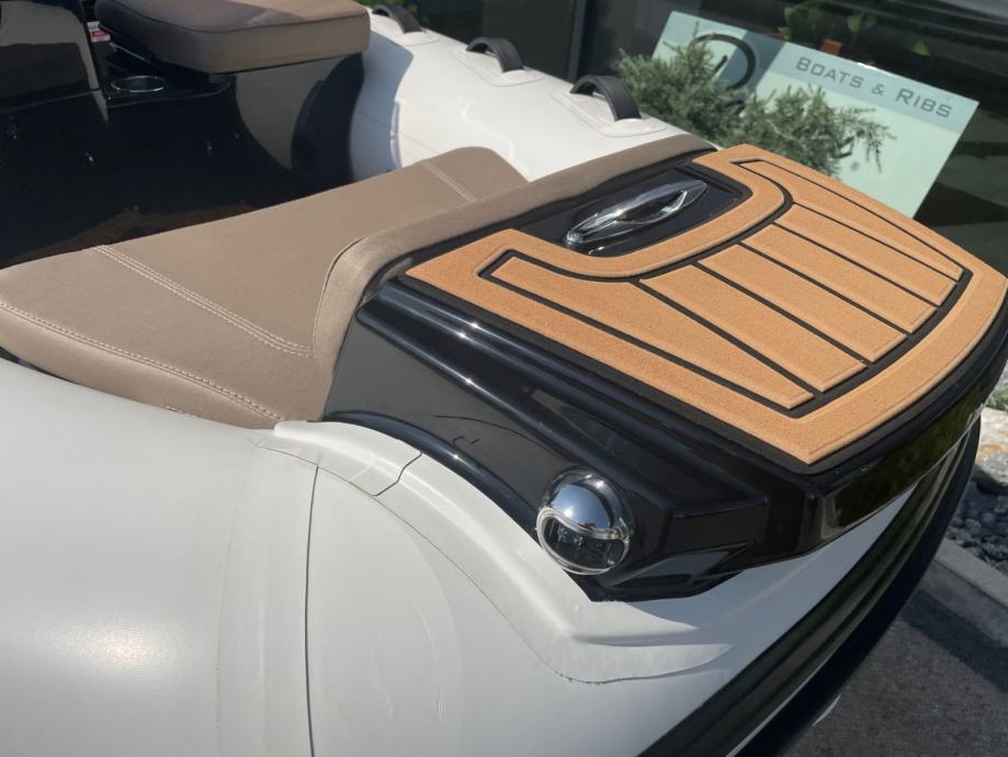 Pramac plovila opremljen je prednjom pločom za stepenice, bojom za vez i bočnim navigacijskim svjetlima, te se završava udobnim sjedalom od SILVERTEX materijala koji propušta vodu i brzo se suši. Kao što smo već spomenuli, dodatna bočna klupa nudi dodatni pretinac za odlaganje i također ima ugrađene držače za čaše. Pored glavne konzole nalazi se i INOX držač, a tubusi su opremljeni ogradama od istog materijala, za dodatnu sigurnost putnika. Glavna klupa je, unatoč ograničenom prostoru, široka i ispod sebe nudi veliki prostor za odlaganje predmeta, tendi, obvezne opreme za čamac, itd. Prednja strana klupe također nudi mogućnost montaže dva AUDIO zvučnika, koji će svakako obogatiti iskustvo plovidbe. Krma čamca završava s dvije stepenice koje olakšavaju ulazak iz vode i pomažu većoj stabilnosti čamca pri plovidbi.