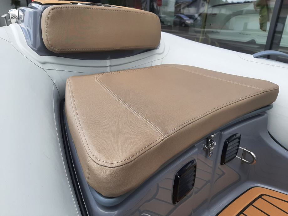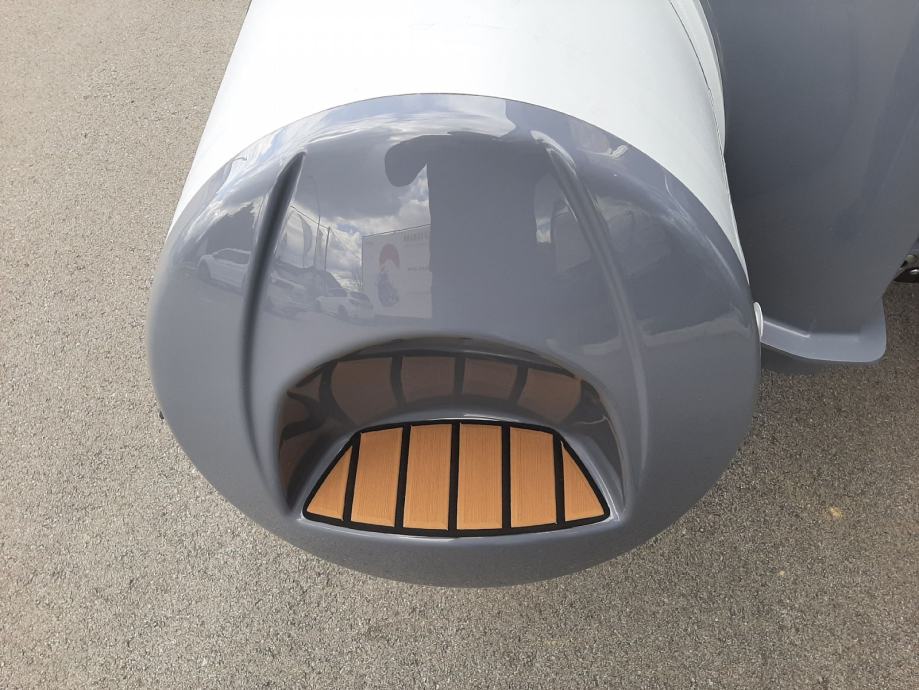 Pramac plovnog objekta opremljen je prednjom stepenicom, pričvršćivačem za vez i navigacijskim svjetlima sa strane, a završava se udobnim sjedalom od materijala SILVERTEX koji propušta vodu i brine se da se tkanine na plovilu brzo osuše. Kao što smo već spomenuli, dodatna bočna klupa nudi dodatnu ladicu za pohranu i također ima ugrađene držače za čaše. Pored glavne konzole nalazi se INOX držač, a tube su opremljene ogradama istog materijala, za dodatnu sigurnost putnika. Glavna klupa, unatoč ograničenom prostoru, široka je i ispod nudi veliki prostor za pohranu predmeta, tende, nužnih stvari za čamac, itd. Prednja strana klupe također nudi mogućnost montaže dva AUDIO zvučnika koji će svakako obogatiti iskustvo tijekom plovidbe. Krma čamca završava s dva stepenika, što omogućava lakši prijelaz iz stražnjeg dijela u središnji prostor. Ako ste zaljubljenik u adrenalinske aktivnosti ili želite uživati u vodenim sportovima sa svojom obitelji ili prijateljima, brigu o tome će preuzeti drog za vuču, koji je pozicioniran na sredini krme. Stražnji tubusi završavaju s ugrađenim stepenicama od poliestera. To omogućava lakši ulazak iz vode i pomaže većoj stabilnosti čamca pri plovidbi.