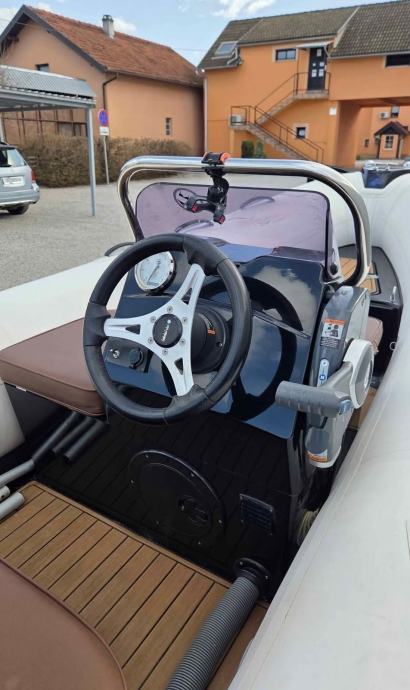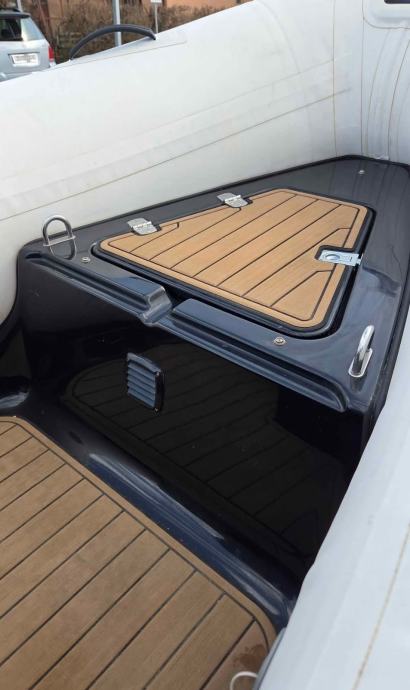 Gumenjak nije serijska varijanta nego je posebno naručen u ovoj kombinaciji boja sa crnim gelcoatom, bijelim tubusima sa crnom gumom i ručkama, tamno smeđim jastučićima i sea deck umjetnu tikovinu na podu plus bimini tenda.