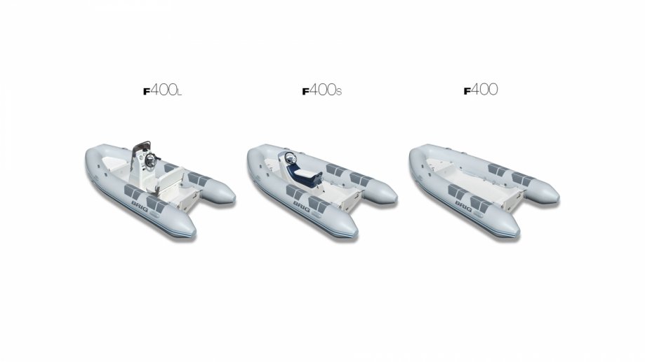 Gumenjak BRIG FALCON F400 dolazi u tri inačice: F400 (otvoren slobodan kokpit), F400L (deluxe konzola, sjedala, upravljački sustav, itd.), F400S (jockey sjedala, deluxe konzola, upravljački sustav, itd.) - vidjeti ilustrativne fotografije uz oglas.