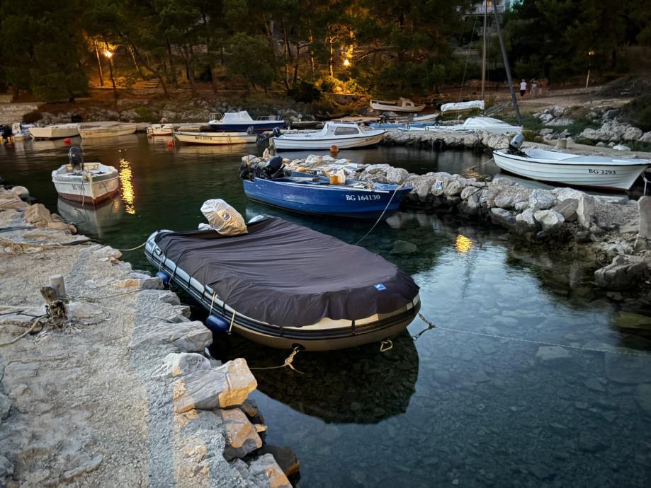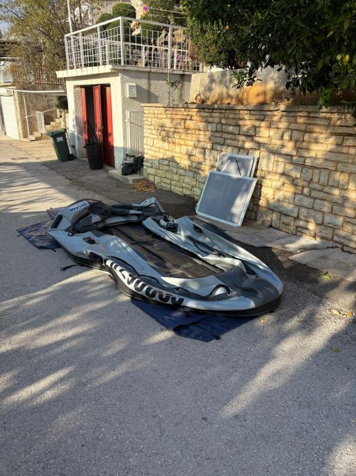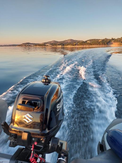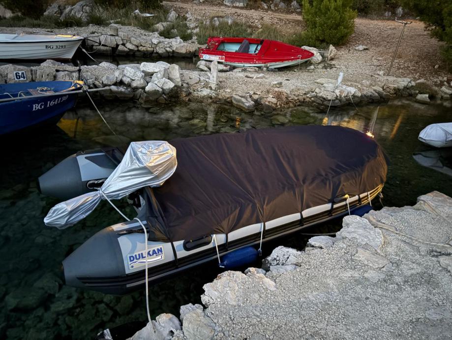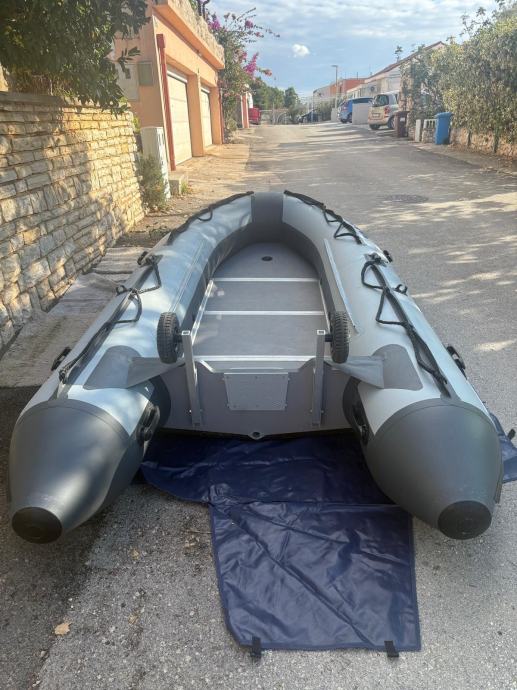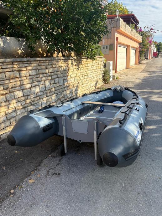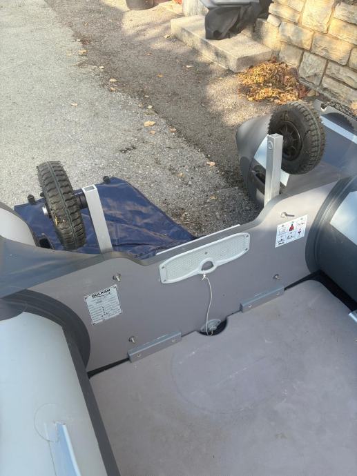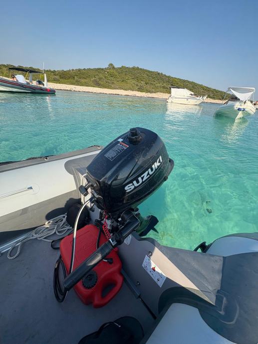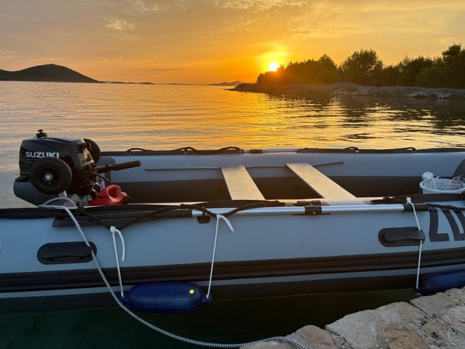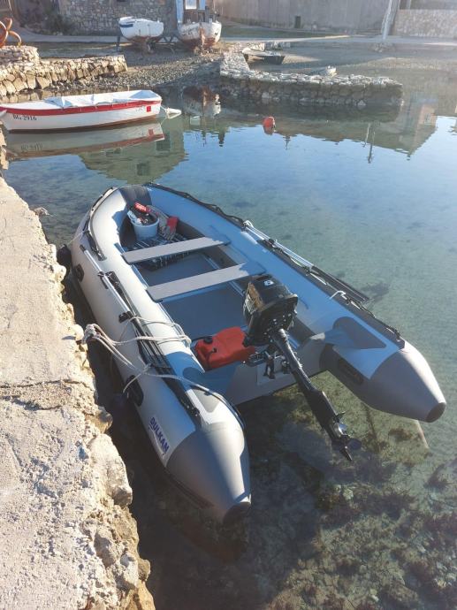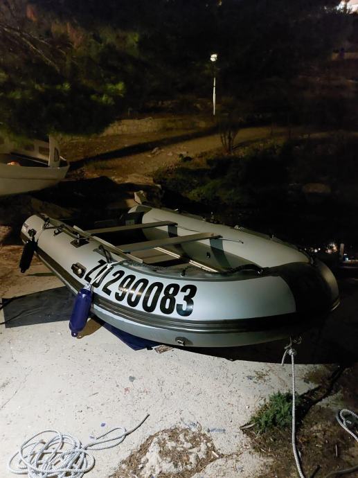 Gumenjak je kao nov uz par sitnih ogrebotina.U moru je bio samo prošlu sezonu dvadesetak dana.Ostalo vrime zapakiran stoji u garaži.Od opreme ima sidro s lancem,sidreni konop,4 konopa,prva pomoć,reflektor,ceradu za kišu,6 bokobrana,kola za vađenje iz mora,sklopive ljestve,dva vesla,pumpu i set za krpanje.Motor kao nov,uredno servisiran do sad ima manje od 40 sati.Od opreme ima ono osnovno što uz njega dolazi sa stalkom,lokotom protiv krađe,rezervarom od 12l i ceradom.