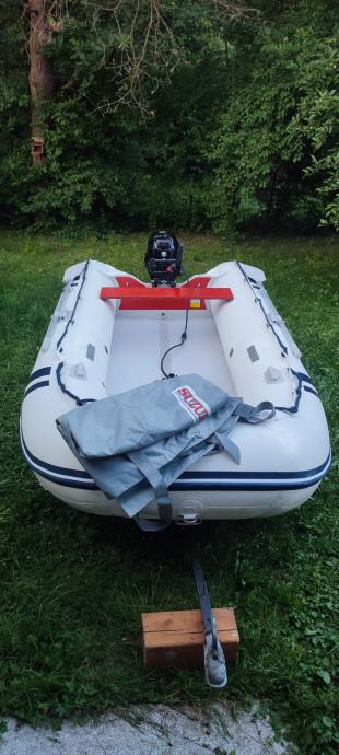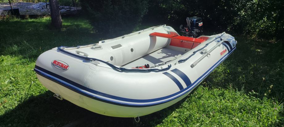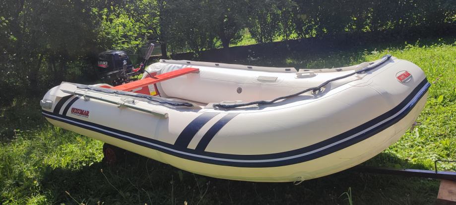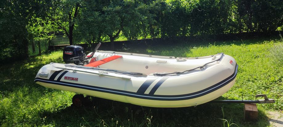 Gumenjak Suzumar DS 350 VIB + Vanbrodski motor Suzuki DF 15 AS + Prikolica + Stalak za motor – Komplet – Kao novo!